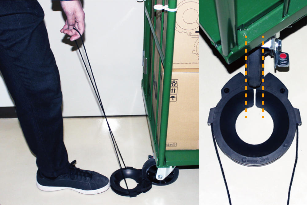 正しくセットされたキャスパーを勢いよく蹴ることで、リングが開きキャスターへ装着されます。キャスパーの蹴り方は、お客様のやりやすい方法をお選びください。弊社では、トライアルを重ねる中で、特に蹴る力が伝わりやすかった「トゥーシュート式」を推奨致します。
