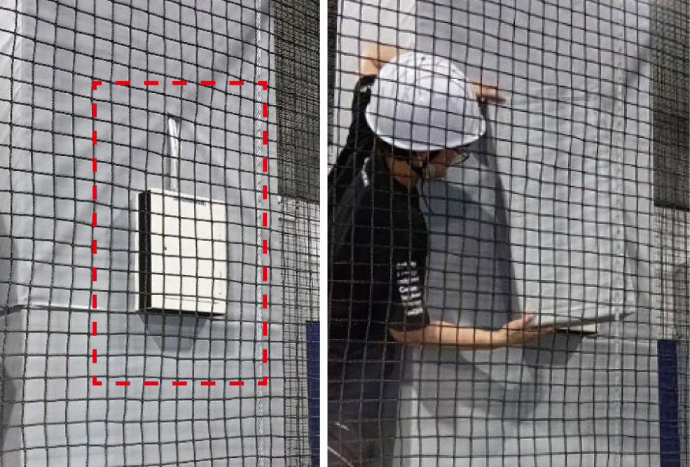 弊社製造部の社員が現場に行き、防護マットの取り付けを行ないました。柱から出っ張っている機械も、ボールがぶつかって破損する恐れがあるため、特注サイズの防護マットを施工しています。