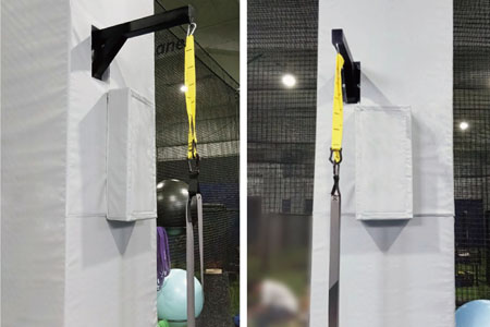 練習中に硬球が柱に当たって損傷することを防ぐため、柱の保護用として、防護マットをご依頼頂きました。柱の上部までしっかりと保護する必要があるため、高さ2mのマット2枚を縦に並べて装着しています。