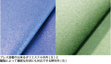 樹脂コーティングの施してあるポリエステル帆布は、熱により表面の樹脂が溶けるため、プレス加工が可能です。トラックシートのような大きなサイズの製品を作る場合、一反の巾だけでは足りないため、プレス溶着により生地と生地を貼り合わせて大きな一枚布を作ります。プレス溶着は密閉性が高いため、より強固な接合を可能とし、トラックシートのような防水機能が求められる製品に向いています。一方で、綿帆布はプレス溶着が出来ないため、縫製により製作を行ないます。縫製はプレス溶着では不可能な複雑な形状にも対応することができ、アールなどの細かな部分も仕上げることが出来ます。